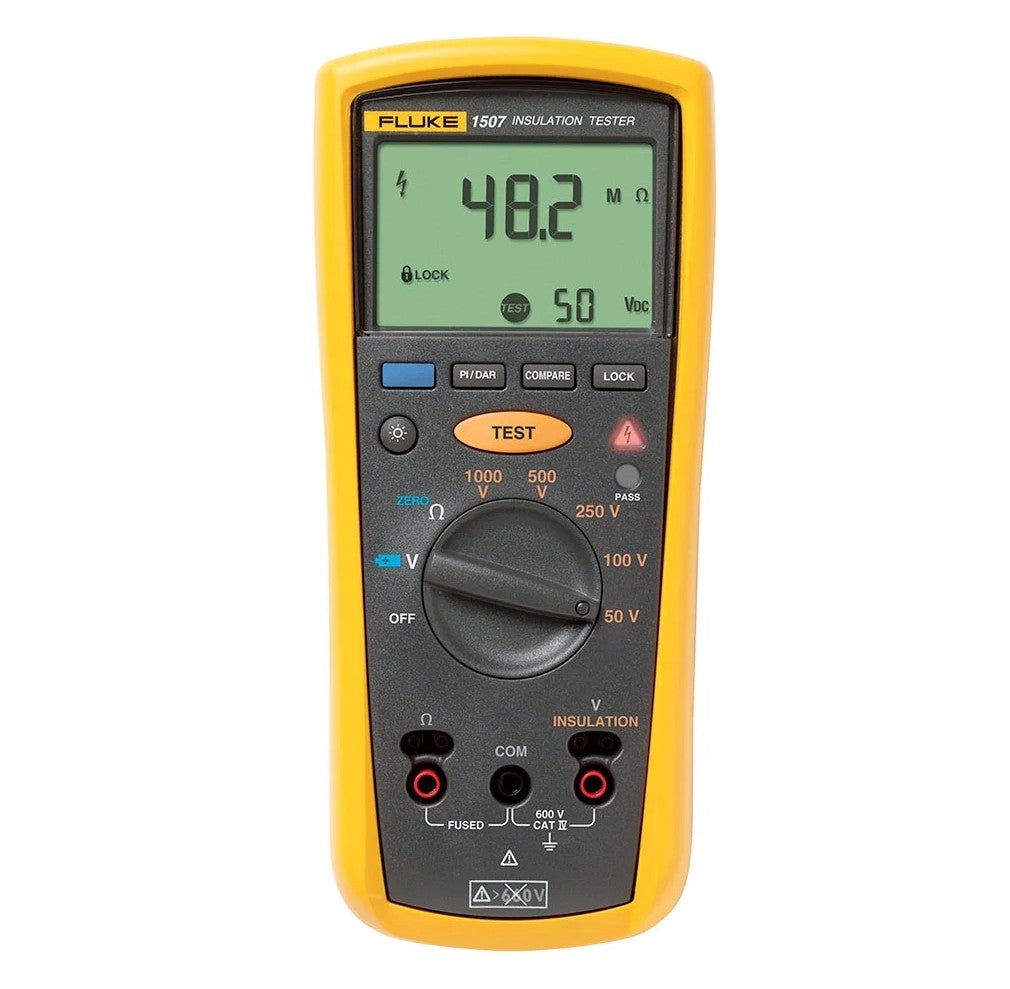 De Fluke 1507 is een compacte en betrouwbare isolatietester die isolatieweerstanden tot 10GΩ kan meten met een meetvoltage tot 1000V. De 1507 kan isolatie testen met verschillende testspanningen, wat deze meter ideaal maakt voor foutopsporing- en onderhoudssituaties. Om het werk onder moeilijke omstandigheden te versimpelen, beschikt deze meter ook over een afstandsprobe. Voor de veiligheid is een functie geïntegreerd die ervoor zorgt dat het apparaat het testen tegengaat als er al een spanning op de lijn staat. Sommige geavanceerde meetfuncties zoals het berekenen van de polarisatie-index en de diëlektrische absorptieverhouding, kunnen ook door deze meter worden uitgevoerd. Daarnaast beschikt de meter over een vergelijk (Pass/Fail) functie, om repetitieve taken te vergemakkelijken.