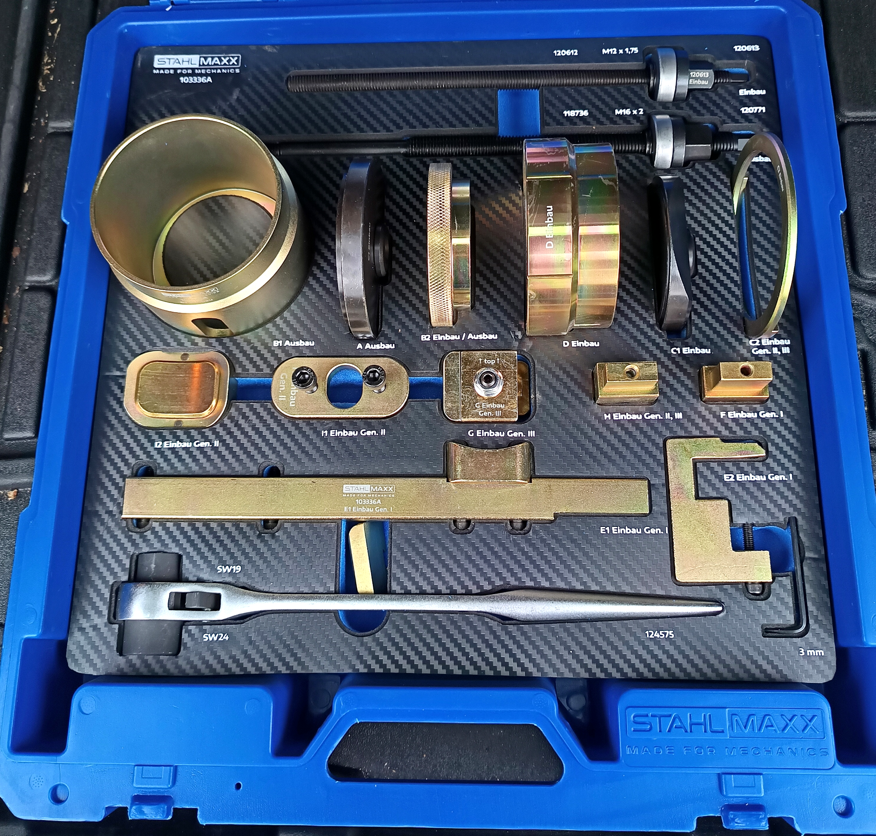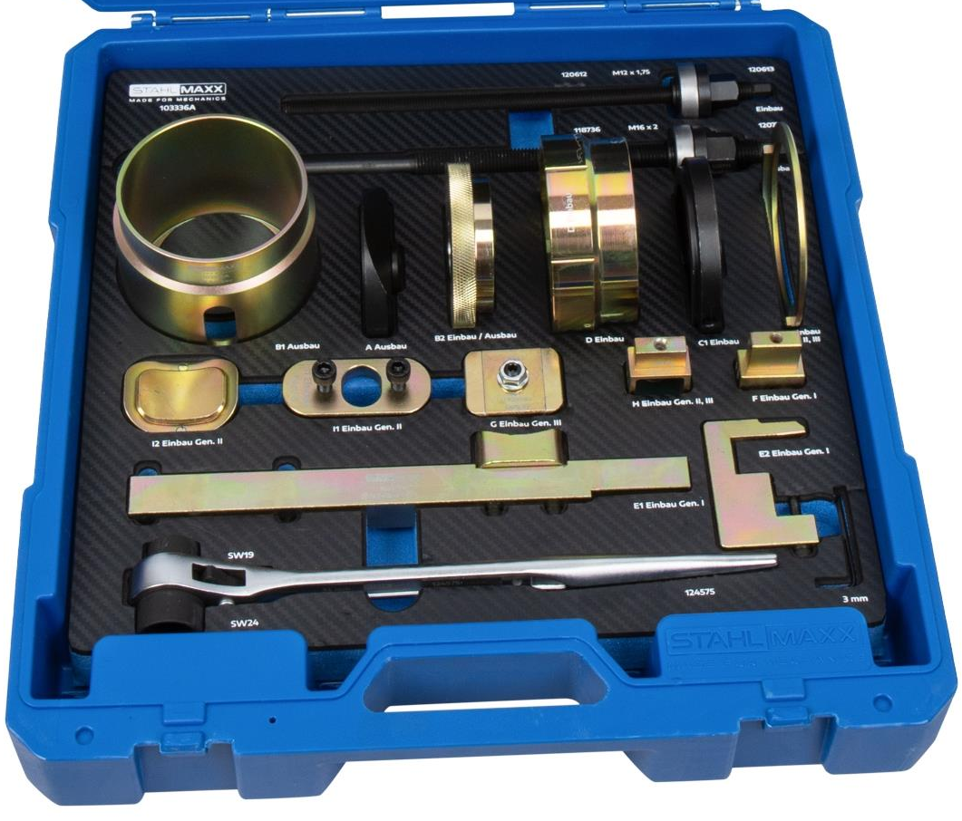 Speziaal gereedschapsset in de nieuwste uitvoering voor het uit- en inbouwen van de tweedelige lagering van de koppelsteun in het motorhulpramen (subframe). Nieuwe ontwikkeling van STAHLMAXX biedt het voordeel dat de verschillende subframe‑generaties I, II en III met één enkele gereedschapsset kunnen worden vervangen.